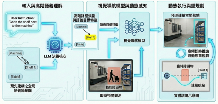 | 研究目標 在真實工業場域中,臨時障礙物與移動人員等動態變異,常使得預建的靜態地圖與即時場景產生落差,導致傳統導航系統的可靠性下降。此外,僅關注「無碰撞移動」的幾何導航邏輯,難以勝任需要深度理解任務指令的複雜需求。為此,本團隊致力於開發結合具身問答(Embodied Question Answering, EQA)架構之導航技術,旨在賦予機器人更高級的場景理解與自主探索策略。 本研究的目標是利用大型語言模型(LLM)作為決策核心,解析自然語言指令,並於語義場景圖中檢索目標以生成高階路徑規劃。在局部執行端,我們致力於導入視覺導航模型(Visual Navigation Model, VNM),將導航轉化為條件序列生成問題。透過整合多模態語義特徵與即時視覺觀測,模型能預測短時間內的連續空間航點,使機器人在無需先驗幾何地圖的狀況下,單純依賴視覺特徵鎖定目標並判斷可通行區域。 本研究最終期望透過模型的高頻即時推論與動態重規劃(Re-planning)機制,使機器人能靈活應對複雜場域中的動態干擾。這將實現從自然語言理解、空間語義檢索到安全避障控制的完整閉環,讓智慧機器人在變動不居的工業環境中,具備如人類般靈活且具備任務認知的移動能力。 |